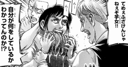 unfreiefreiheit-aot.hatenablog.com サシャの食欲と内なる感情 アイデンティティと自由というテーマについて哲学者大放出による解説を終えたところで、『進撃』の登場人物の考察を続けましょう。 そろそろ、かのじょにも出てきてもらわねばなりません。 あ…